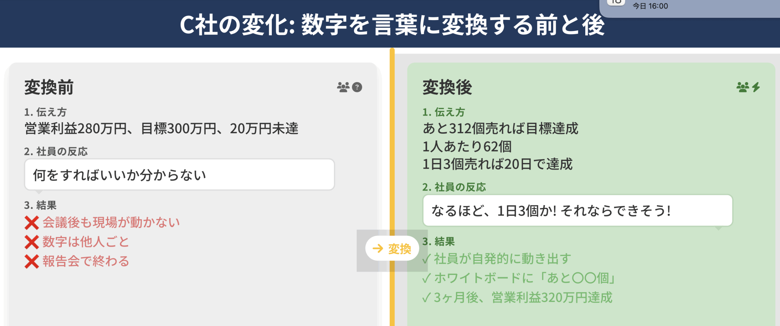 この変換により、数字が「社員の心を動かす言葉」になります。