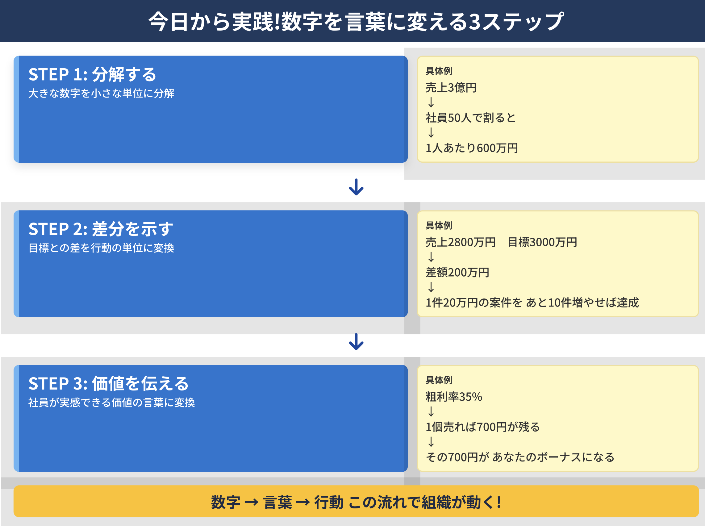 では、あなたも「数字を言葉に変える」技術を身につけるには、どうすればいいのでしょうか。具体的な3ステップをお伝えします。