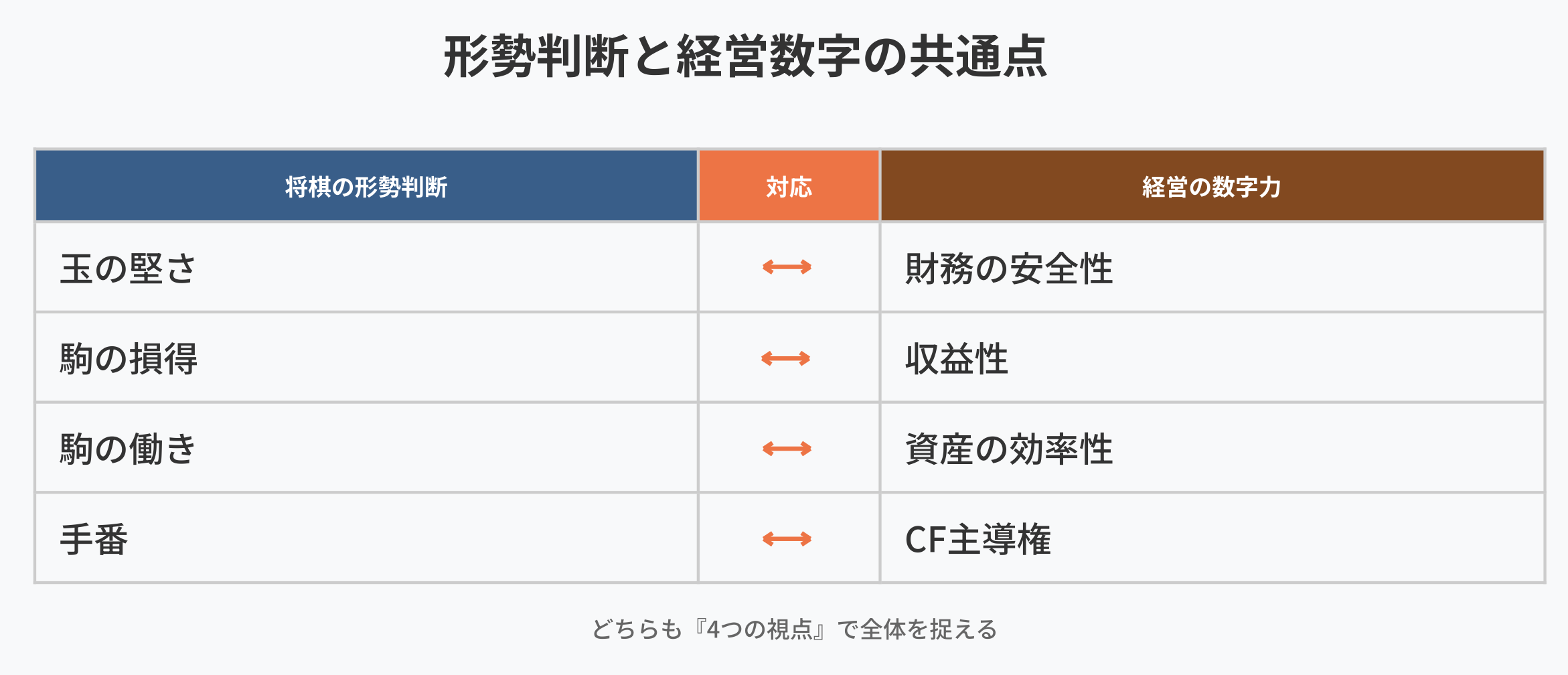 - 玉の堅さ=財務安全性、駒の損得=収益性、駒の働き=資産効率、手番=CF主導権