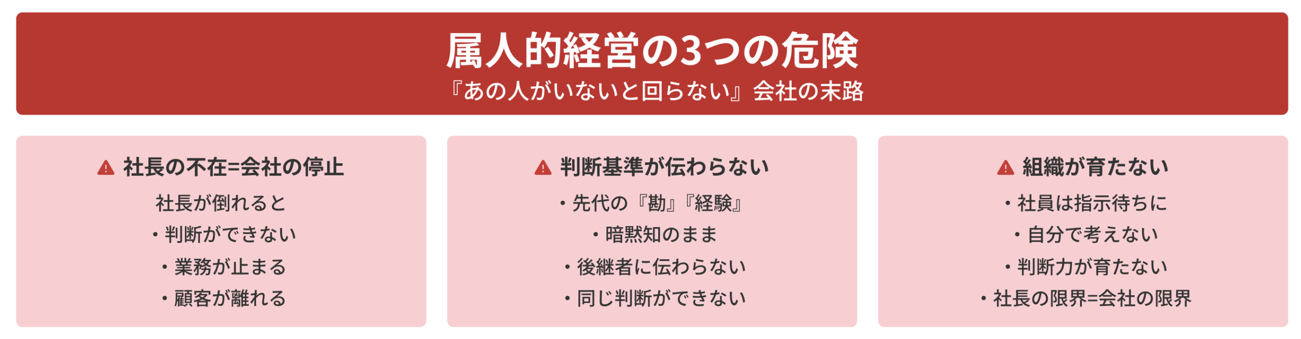 属人的経営の最大の危険は、社長が不在になると会社が止まることです。