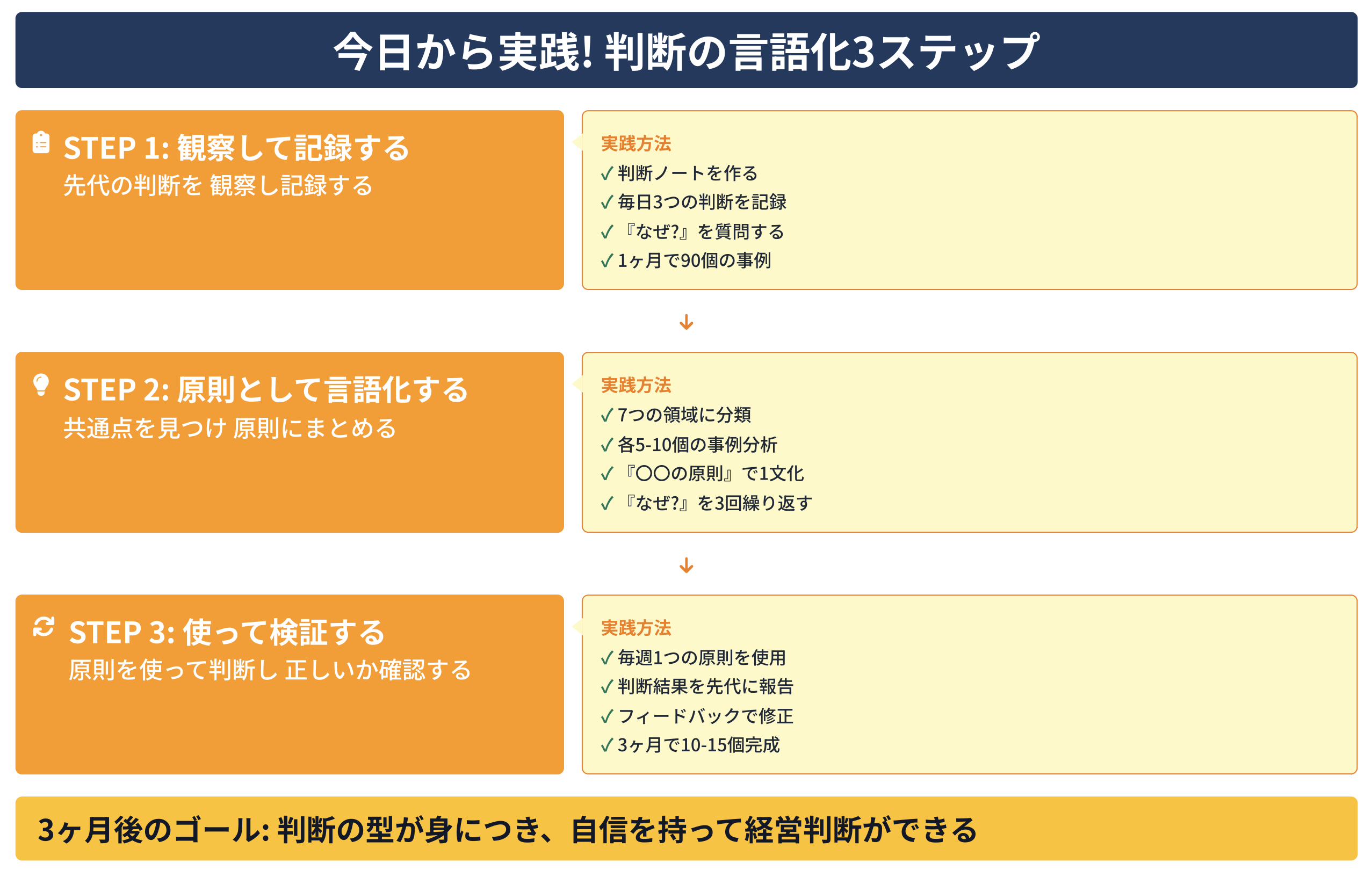 では、あなたも「判断の言語化」を始めるには、どうすればいいのでしょうか。具体的な3ステップをお伝えします。