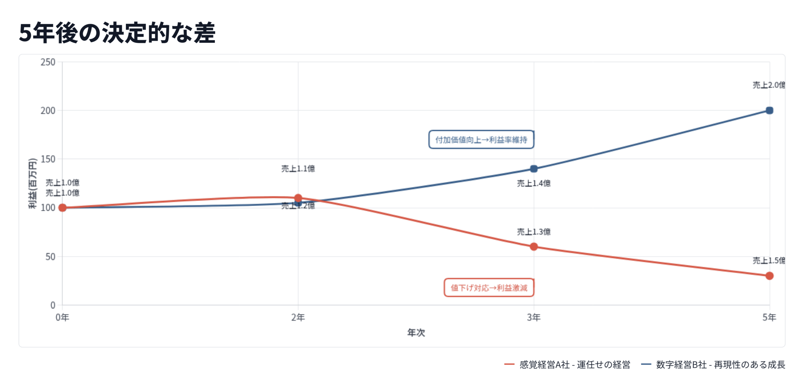 感覚で判断する経営と、数字で判断する経営。スタート地点では大きな差はありません。しかし、3年後、5年後を見ると、その差は決定的なものになっていきます。